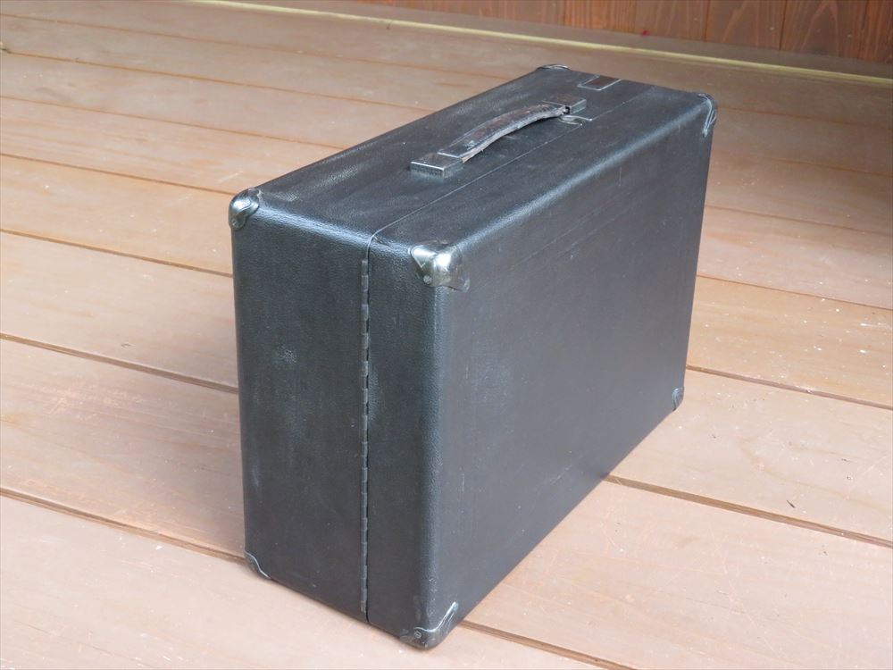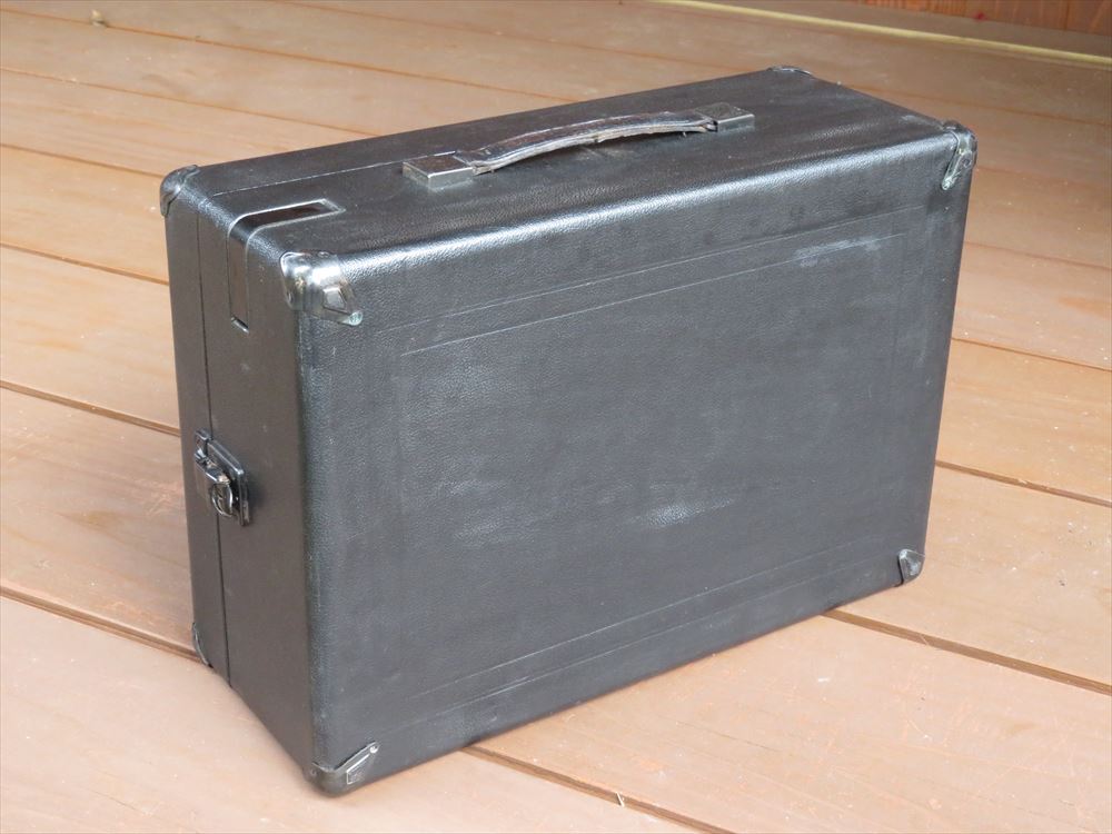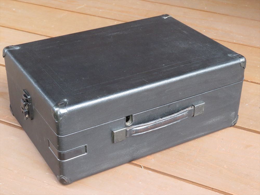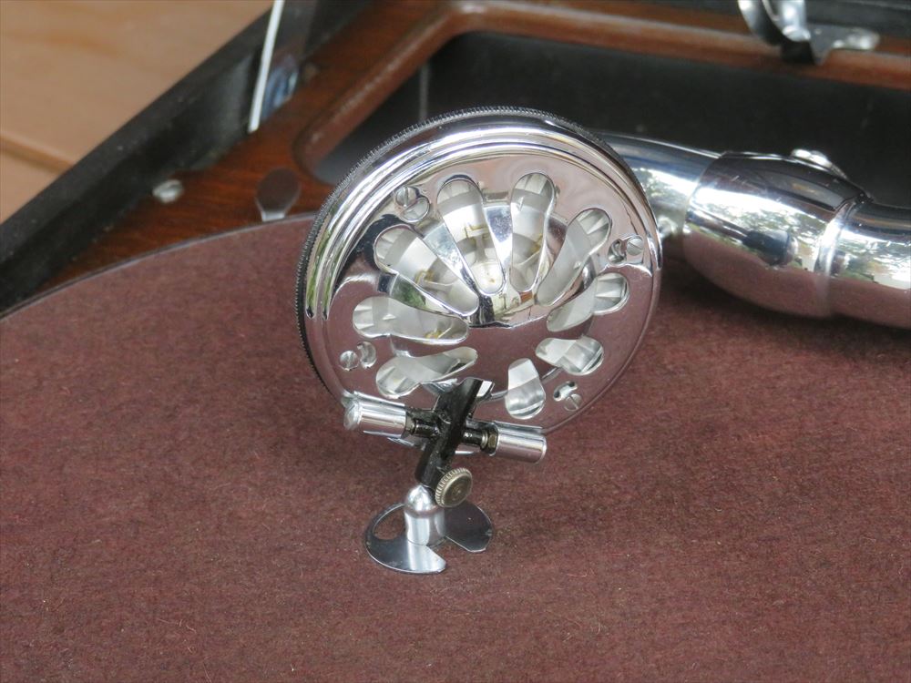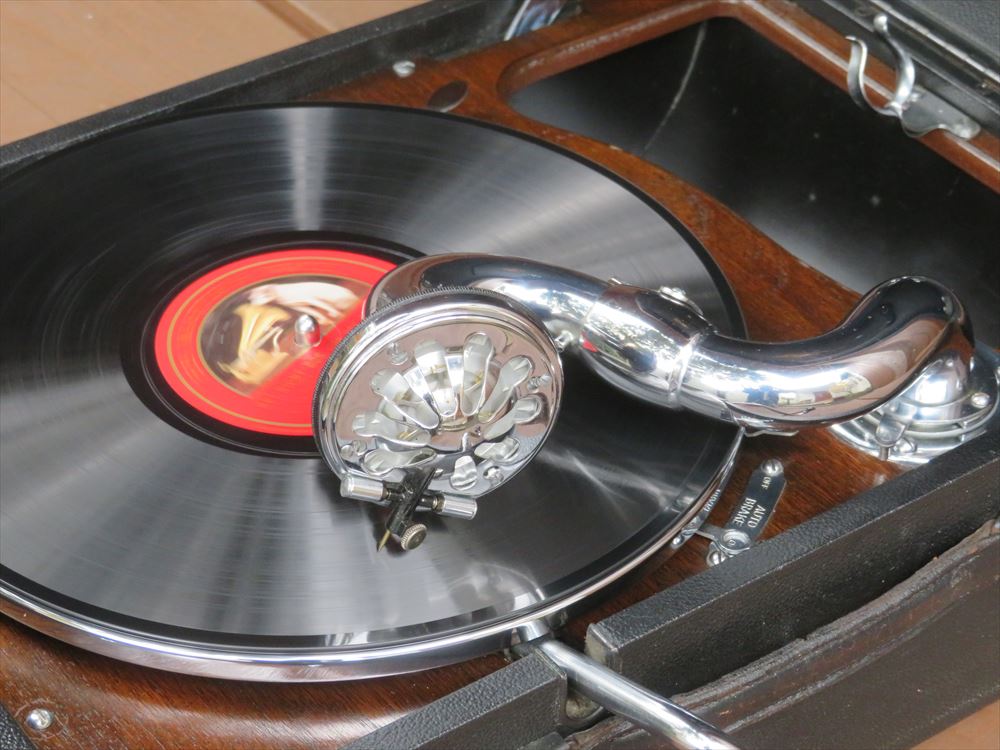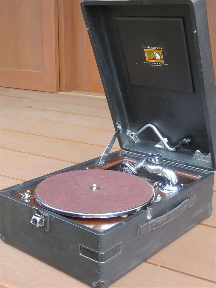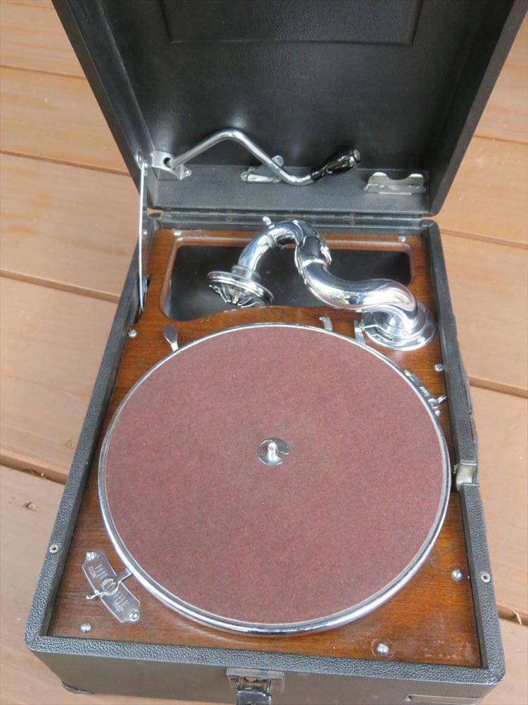 ポータブル蓄音機の傑作#102。 ブラック・ケースにウッドデッキ仕様。サウンドボックスはNo.5B、1丁ゼンマイ・モーター、25cmターンテーブル。外形寸法:29Hx15Wx41.5cm